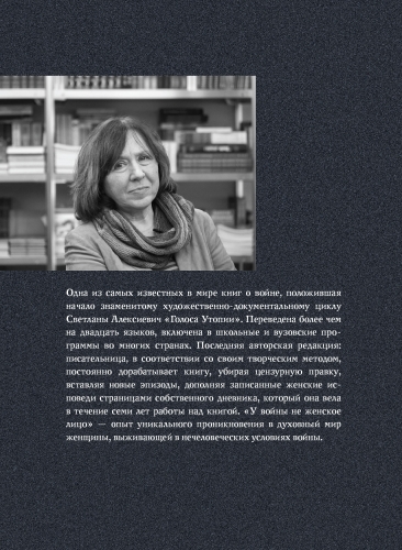 Одна из самых известных в мире книг о войне, положившая начало знаменитому художественно-документальному циклу Светланы Алексиевич «Голоса Утопии». Переведена более чем на двадцать языков, включена в школьные и вузовские программы во многих странах. Последняя авторская редакция: писательница, в соответствии со своим творческим методом, постоянно дорабатывает книгу, убирая цензурную правку, вставляя новые эпизоды, дополняя записанные женские исповеди страницами собственного дневника, который она вела в течение семи лет работы над книгой. «У войны не женское лицо» — опыт уникального проникновения в духовный мир женщины, выживающей в нечеловеческих условиях войны.