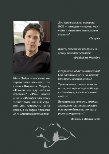 Книга, яка очолила список бестселерів «Нью-Йорк таймс» та була обрана книгою року Клубом Опри Вінфрі. Книга, про яку сам Мітч Елбом сказав: «Це найважливіше, що я написав!» Книга про віру, надію та любов. Про розуміння та дружбу. Про те, як вижити навіть у найважчі часи, вибачаючи, допомагаючи ближнім, вірячи в добро і зберігаючи гідність.